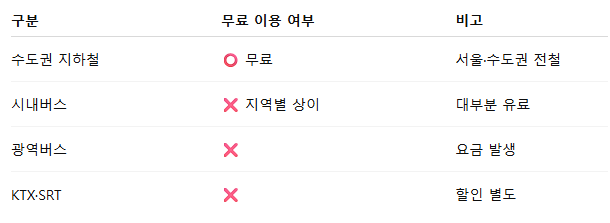👉 지하철 무료 ⭕ / 버스 무료 ❌가 기본 원칙이며, 버스는 일부 지자체만 별도 지원합니다.