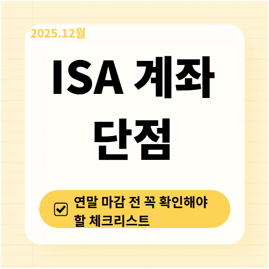 ISA 계좌는 절세 계좌로 잘 알려져 있지만, 연말이 다가오면 “그냥 만들어만 두면 되는 것인지”, “올해 안에 뭘 해야 하는 건지” 헷갈리는 경우가 많습니다. 실제로 ISA 계좌는 연말 전에 확인하지 않으면 혜택을 제대로 누리지 못하거나 오히려 불리해질 수 있는 구조를 가지고 있습니다. 2025년 기준으로 ISA 계좌의 대표적인 단점과 연말 마감 전에 반드시 점검해야 할 사항을 정리해봅니다.
