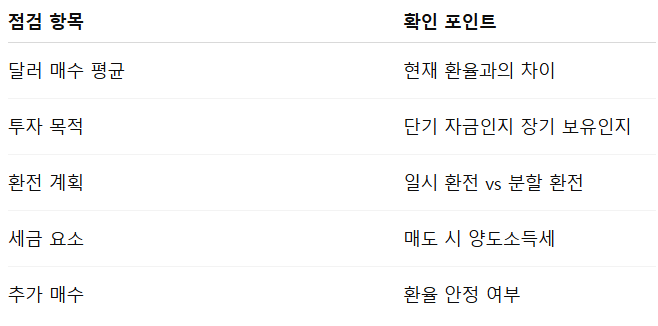 장기 보유 목적이라면 환율 변동을 감내하는 전략도 가능합니다. 반면 단기 자금 계획이 있다면, 한 번에 결정하기보다 분할 환전으로 리스크를 줄이는 쪽이 현실적입니다.