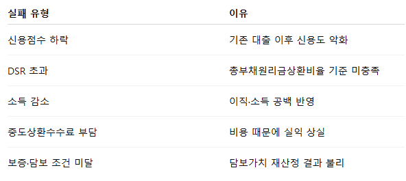 대환대출 실패는 특정 유형에서 반복적으로 나타납니다. 대표적인 사례를 정리하면 다음과 같습니다.