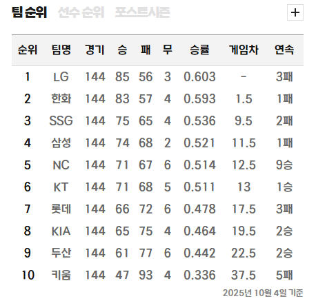 포스트시즌: 정규시즌 종료 후 상위 팀들이 와일드카드·준플레이오프·플레이오프·한국시리즈 등의 형태로 진행됩니다.