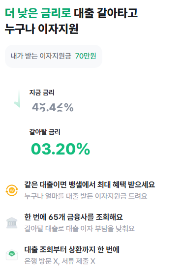 복잡한 서류 제출 없이 마이데이터를 통해 여러 금융사의 조건을 한눈에 볼 수 있는 플랫폼입니다. 반복 조회해도 신용점수에 영향이 없으므로 본인의 신용 상태에서 가능한 최저 금리를 찾는 데 매우 유용합니다.
