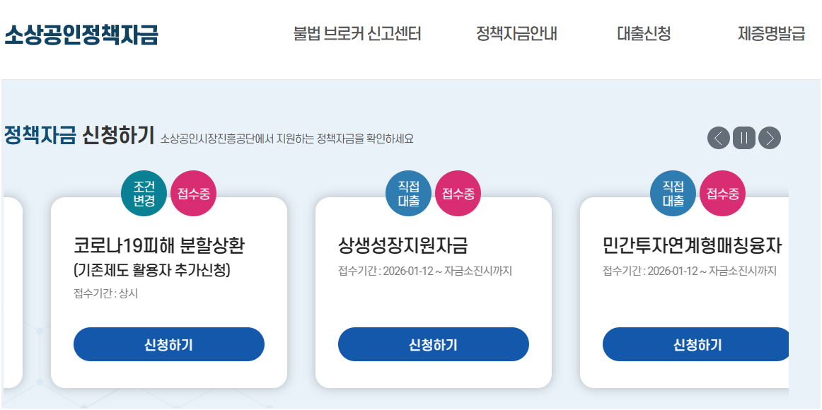 위 공식 소상공인 정책자금 홈페이지에 접속하시면 본인의 업종과 신용도에 맞는 자금 종류를 바로 확인하실 수 있습니다.