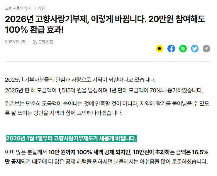 오늘은 새롭게 바뀐 고향사랑기부제 20만원 공제 혜택부터 실패 없는 고향사랑기부제 답례품 추천, 그리고 간편한 위기브 이용법까지 한눈에 정리해 드립니다.