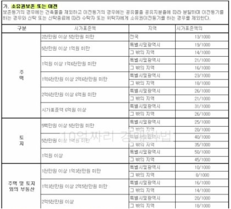 토지의 경우 시가표준액 5백만원 이상 ~ 5천만원 미만인 경우 서울·광역시는 25/1,000 등 적용됨