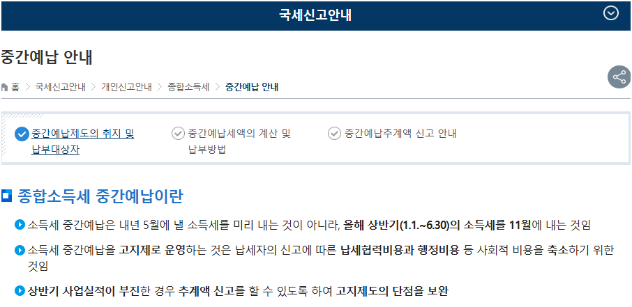 요약하자면, 종합소득세 중간예납은 전년도 세금의 절반을 11월 30일까지 미리 납부하는 제도입니다.