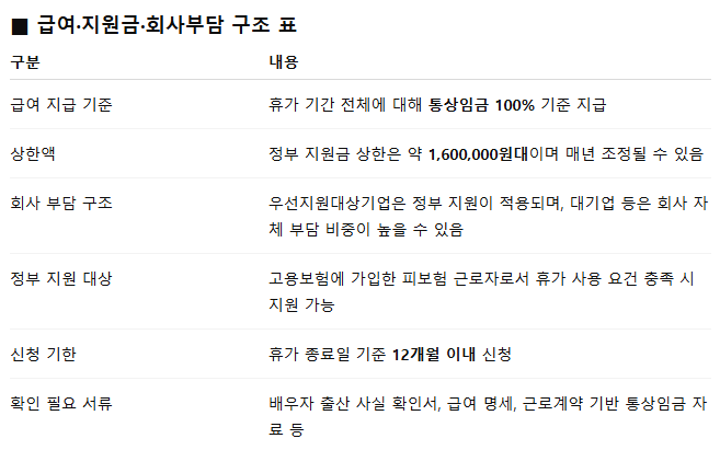 아래 표는 지원금·급여·회사 부담 방식·신청 요건을 간결하게 비교한 내용입니다.