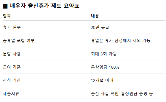 배우자 출산휴가의 기간, 사용 기한, 공휴일 포함 기준 등 주요 요소는 아래 표와 같습니다.