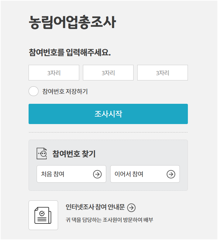 참여번호가 있으신 경우 농림어업총조사 홈페이지에서 접속하여 농림어업 총조사 온라인 조사하기를 바로 시작할 수 있습니다.