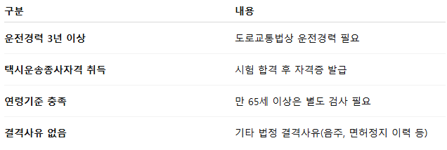 자격 기준은 법제처 택시운전자격 안내사이트에서 확인하실 수 있습니다..