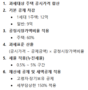 종부세는 공시가격이 일정 기준을 초과하는 주택·토지를 보유한 경우 부과되는 세금입니다. 2025년 기준으로 종부세 계산은 아래 6단계를 거칩니다.