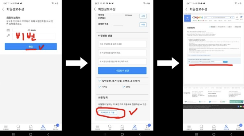 👉 PC 버전은 마이쿠팡 → 개인정보 확인/수정 → 회원탈퇴