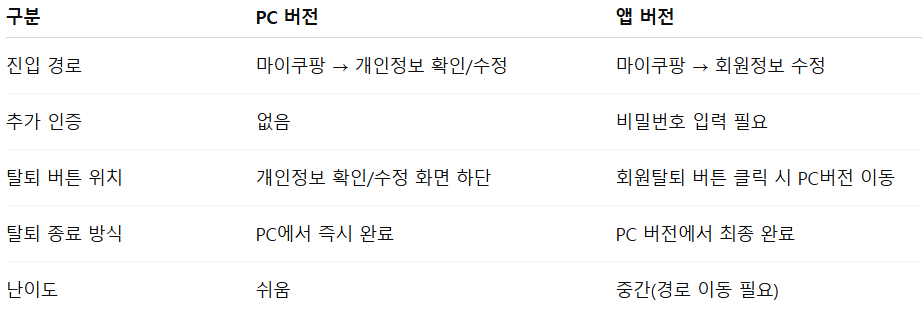 📌 [표 2] 쿠팡 탈퇴 경로 비교(PC vs 앱)