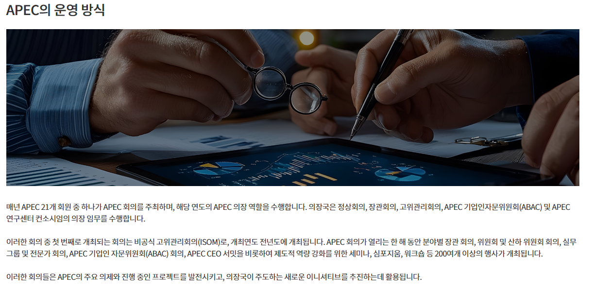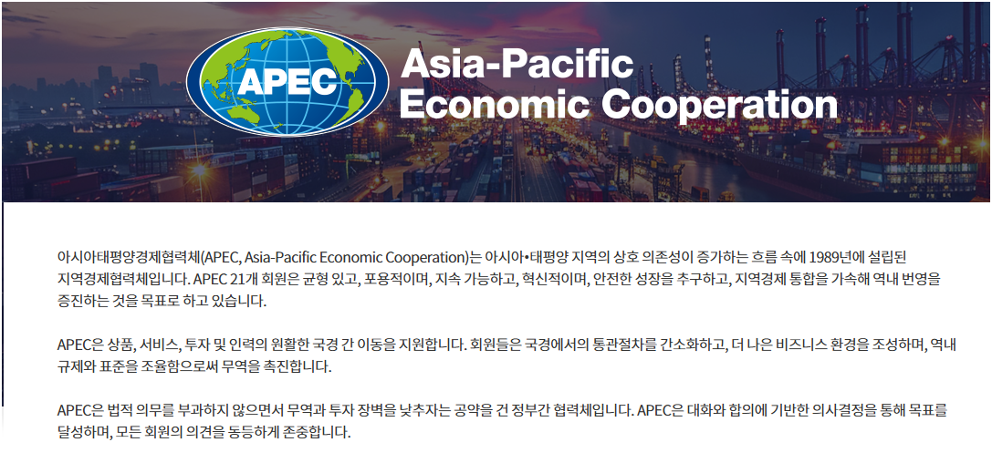 APEC은 아시아·태평양 지역의 21개 회원국이 참여하는 경제협력체로서, 무역·투자·디지털경제·기후협력 등을 논의하는 다자간 핵심 무대입니다. 이번 한국 개최는 특히 글로벌 경제 불확실성, 공급망 재편, 디지털 전환이라는 맥락에서 더욱 주목됩니다.