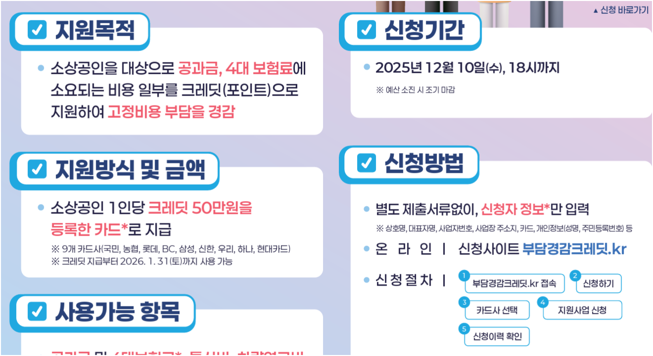 전기요금·가스비·통신비·4대보험 등 매달 나가는 고정비가 크게 늘면서 소상공인의 실질적 부담이 커지고 있습니다. 이런 상황에서 정부가 운영 중인 소상공인 부담경감 크레딧이 다시 주목받고 있습니다. 이 글에서는 지원 대상 확인 → 신청방법 → 사용처 → 체크리스트까지 한 번에 확인할 수 있도록 정리했습니다.