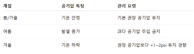 겨울철에는 권장 공기압보다 +1~2psi 높게 설정하는 경우가 일반적
