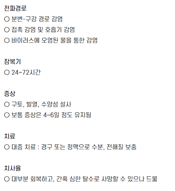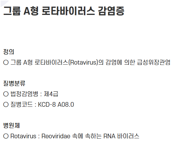 자세한 내용은 질병관리청 감염병포털 로타바이러스 정보를 참고하시면 됩니다.