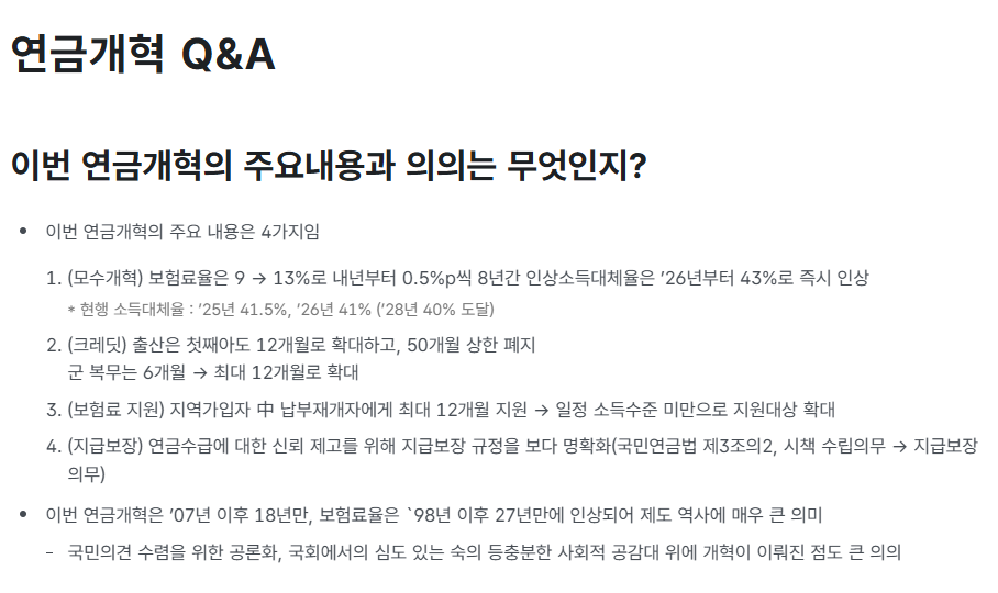 소득대체율 상향 등 연금개혁 구조가 미치는 영향에 대한 자세한 내용은 보건복지부 공식 Q&A 자료(보건복지부 연금정책 안내 참고)를 참고하시면 됩니다.