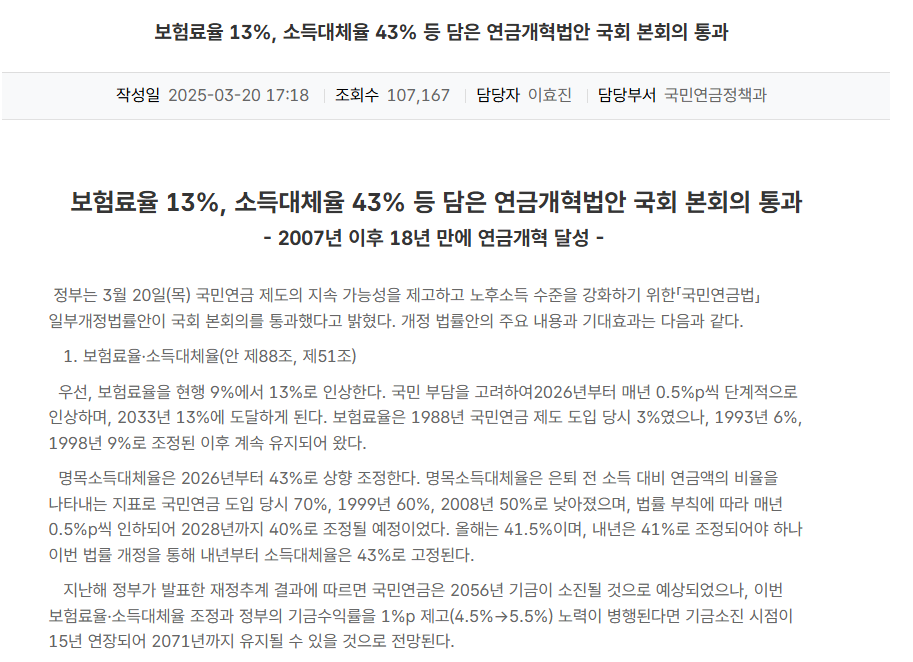 국민연금 소득대체율 상향 관련 자세한 내용은 보건복지부 보도자료를 참고하시면 됩니다.